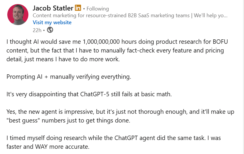 In this case, a marketeer is frustrated because he needs to constantly manually check AI’s outputs when he uses it for research.