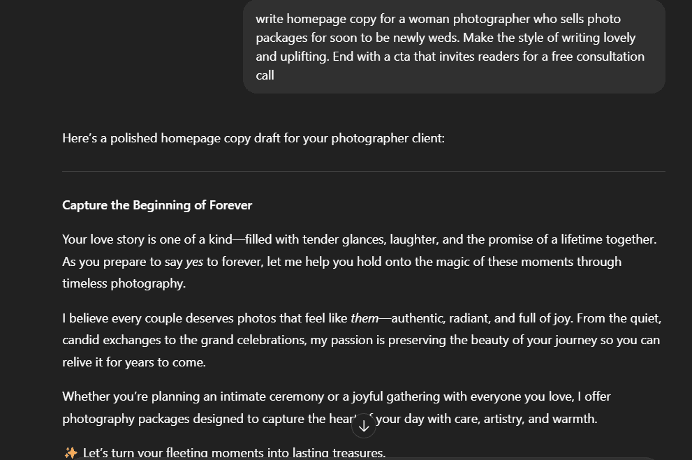 I asked for uplifting copy, not sentimental clichés. Also, the output is generic enough that it can be applied to just about any wedding photographer.